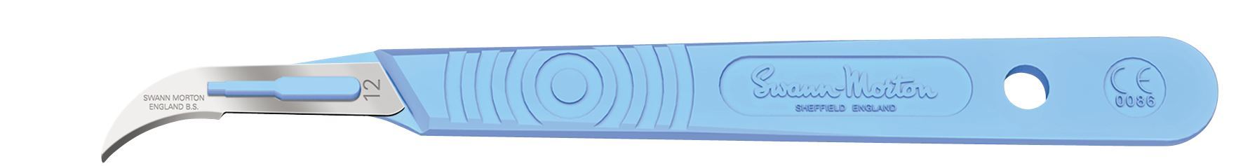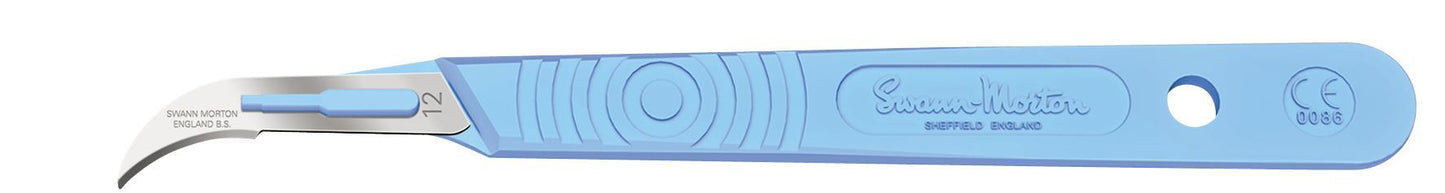 The swann morton No 12 sterile disposable scalpels carries a graduated measure on the reverse of the handle (for indication only) to mirror our range of metal stainless handles and is marked with the CE symbol which previously only appeared on the outer product packaging. The swann morton No 12 sterile disposable scalpels are individually packaged into a transparent thermos-formed tray providing improved product visibility and developed to assist in safe passing techniques.